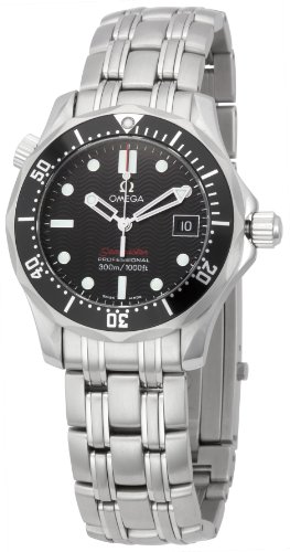 Stainless steel case with a stainless steel bracelet. Unidirectional black ion-plated bezel. Black dial with luminous hands and dot hour markers. Minute markers around the outer rim. Date displays at the 3 o'clock position. Quartz movement. Scratch resistant sapphire crystal. Screw in crown. Case diameter: 36.25 mm. Case thickness: 11.4 mm. Deployment clasp. Water resistant at 300 meters / 1000 feet. Additional Info: battery end of life indicator/ easy time zone change/ helium escape valve. Omega Seamaster James Bond Midsize 300m Watch 212.30.36.61.01.001.Omega Men's 212.30.36.61.01.001 Seamaster 300M Quartz Black Dial Watch Specifications | Sale - Review & Buy at Cheap Price